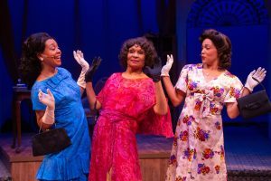 Karole Foreman, Vivian Reed, Jenna Gillespie Byrd (all photos by Kayte Deioma Creative)Long before he began his twenty-year run as Artistic Director at the Pasadena Playhouse, Sheldon Epps conceived and directed the musical revue Blues in the Night which had a short run on Broadway in 1982. Nearly 40 years later, International City Theatre in Long Beach, partnered with the Ebony Repertory Theatre in Los Angeles, has staged a lively, energetic, musically perfect revival that has audiences clapping along, desperate to be dancing in their seats and cheering the quartet of performers and five-piece onstage band. Blues in the Night is the musical audiences have wanted and needed after 18 months of Covid isolation from live theater. Director Wren T. Brown has masterfully staged the show aided by choreographer Keith Young who has provided the right steps at the perfect time. Scenic designer Edward E. Haynes Jr.’s simple yet elegant depiction of three hotel rooms and lobby in a 1948 Chicago hotel perfectly frame the action. Donna Ruzika’s painterly lighting contributes the right mood for each song, whether it be a brightly lit ensemble number or bluesy solo sung in a soft-focus spot. Kim DeShazo’s colorful and varied period costumes fit each character perfectly. Musical Director William Foster McDaniel leads the quintet of talented musicians. The second act begins with a Jam Session and each band member—Fernando Pullman on trumpet, Scott Mayo on woodwinds, Del Atkins on bass, Clayton Cameron on drums as well as McDaniel on piano—gets to strut their stuff to the audience’s delight.